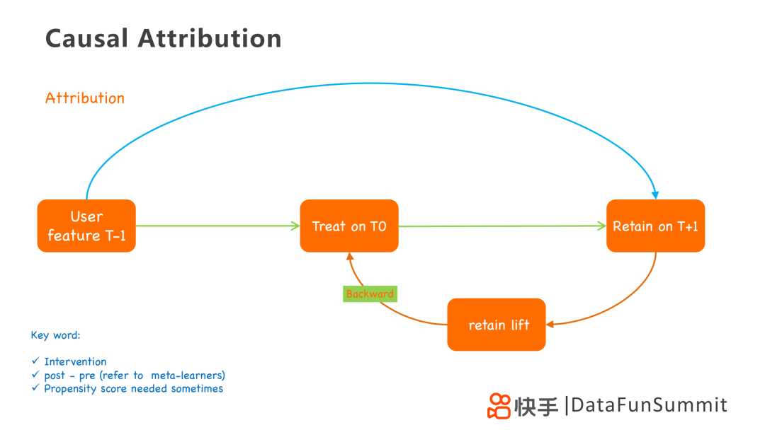 在这里我们再用这个框架图来讲解一下因果归因的思路,它用到了用户三个状态T-1,T0和T+1。T0状态即为用户受到无限处理的影响的状态。从T-1到T+1,是利用T-1状态的一些特征去预测T+1状态的留存情况,类似PSM倾向性得分。另一条路从T-1到T0再到T+1,是在经过treatment后,进行回溯。从T+1到T0,计算retain lift,这个lift可以认为是treatment带来的,然后采用backward或者credit assignment的方式归因到treatment上。