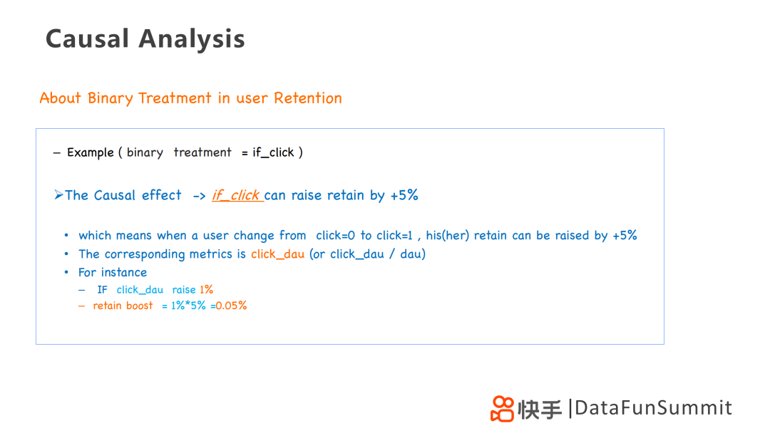 经过PSM之后,我们假设得到结论:点击会让留存率提升5%,意味着一个用户进行点击行为后,其留存可以提升5%,反映到相应的指标便是click_dau(点击日活跃人数)。例如click_dau提升了1%,那么整体留存率应该提升5%×1%=0.05%。