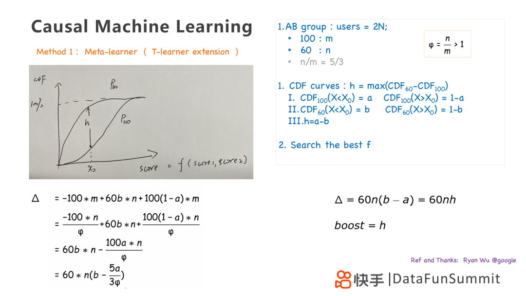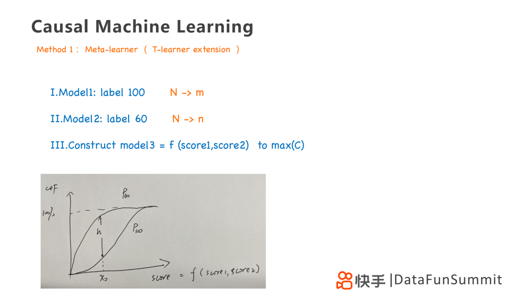 第一个方法是Meta-learner,是T-learner模型的一个拓展,通过训练两个模型,并画出购买用户的累计分布曲线,找到两个策略最大的gap,在图中即为h。我们可以通过累计分布曲线去优化,得到第三个策略,是前两个策略的线性叠加。