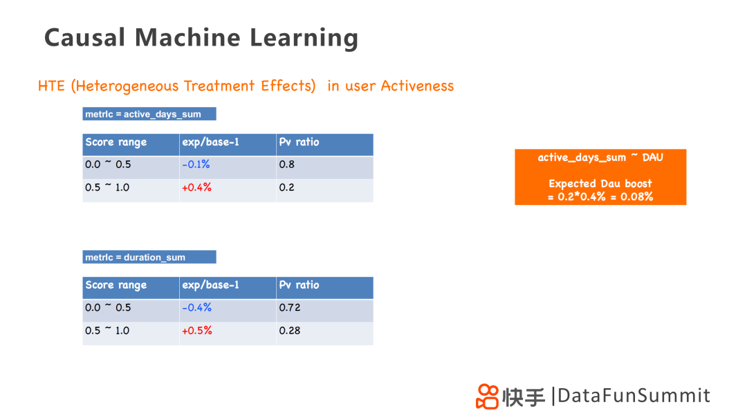 我们以0.5作为分水岭。指标active_days_sum为0-0.5的用户其活跃会减少0.1%,为0.5-1的用户其活跃会增加0.4%;指标duration_sum为0-0.5的用户其活跃会减少0.4%,为0.5-1的用户其活跃会增加0.5%。