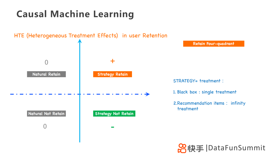 对于留存而言,HTE以是否采取策略和是否留存为维度划分为四个区域,其中采用的策略针对不同的业务问题,可以采用单一处理的黑盒策略,也可以采用无限处理的推荐策略。因此HTE是一个四象限问题,分别为: