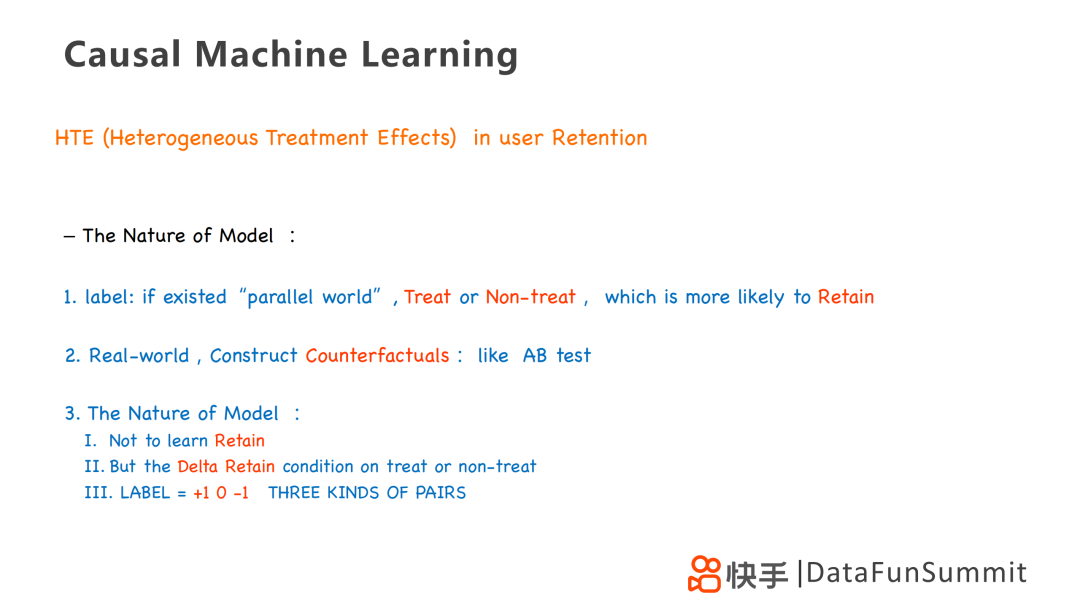 在自然模型中,采用打标签的方法,类似于现实生活中的AB test,但是可以对每个实验组设置一样的条件,就像“平行世界”一样,仅有是否treat和是否留存的标签,便可以直观的得到treatment对留存的影响。