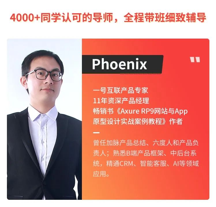 在这里也隆重介绍一下我们的Phoenix老师。Phoenix老师一直是一线的产品专家,拥有 11 年的产品实战经验;同时拥有 6 年的产品教学经验,累计教授学员高达 5000+!