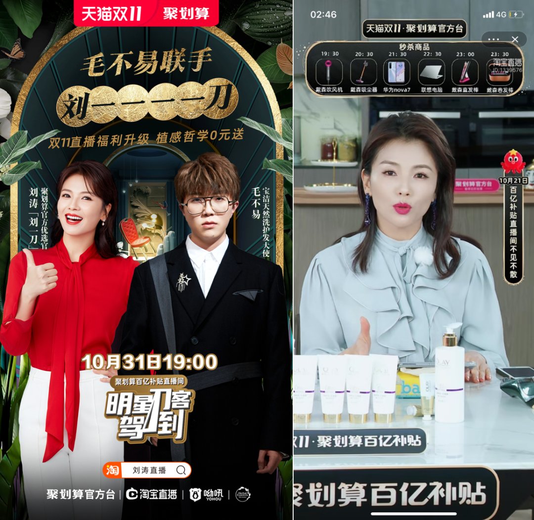 今年的双11聚划算则是创新了直播间玩法,结合50场高频明星直播,最大程度地发挥出了明星主播们的TOP价值。在预热期20日当晚,刘涛直播间就带来了千万级观看量,创造了多个百万爆款单坑。
