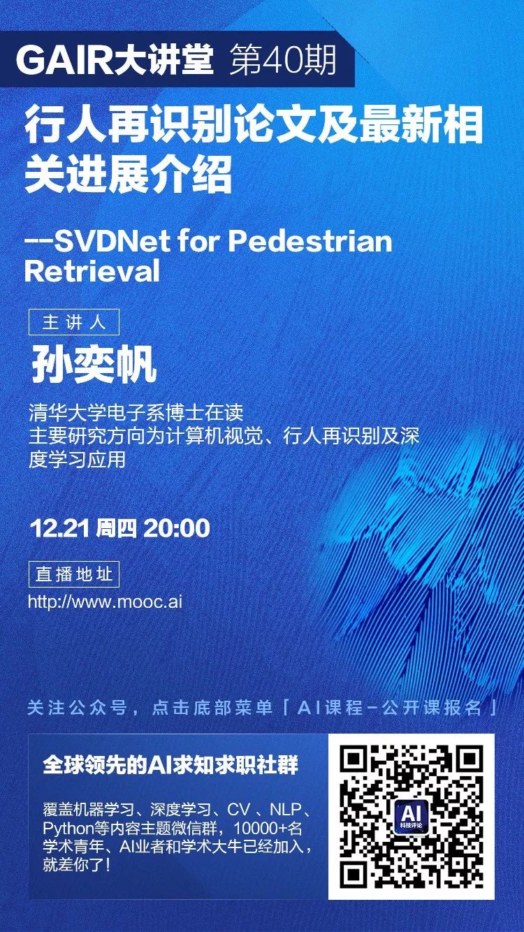 2017年,行人再识别研究飞速进展。例如,在公开数据集Market-1501上,一选正确率从2016年ECCV中较高的65.9%提高到2017年ICCV中的80+%,arxiv近期一些paper更是将该指标刷新到95%左右。本讲座将重点介绍ICCV2017中一篇spotlight论文《SVDNet forPedestrian Retrieval》。这篇论文将全连接层权矩阵解读为特征空间中的一组投影基或是一组模板,联合奇异值分解(SVD)优化深度特征学习过程,取得了显著的性能提升,并揭示了非常有趣的机理现象。