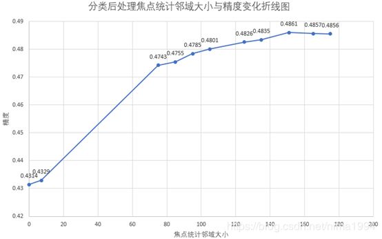 表6.3 焦点统计邻域大小与精度折线图,0表示没有进行焦点统计即原始预测输出。