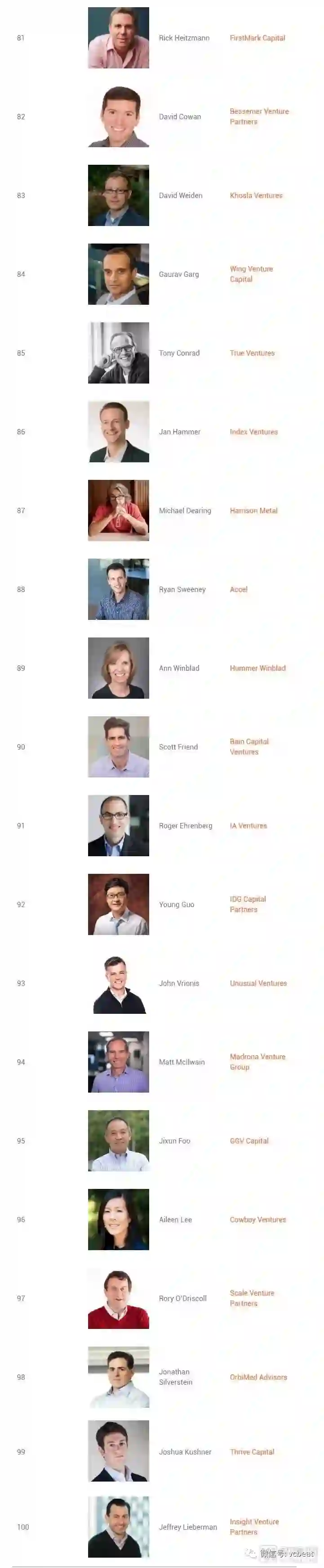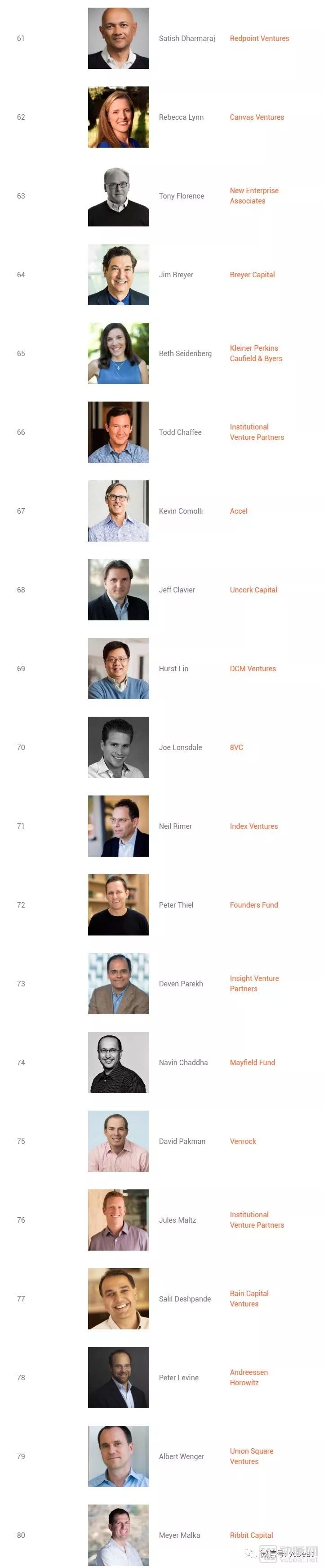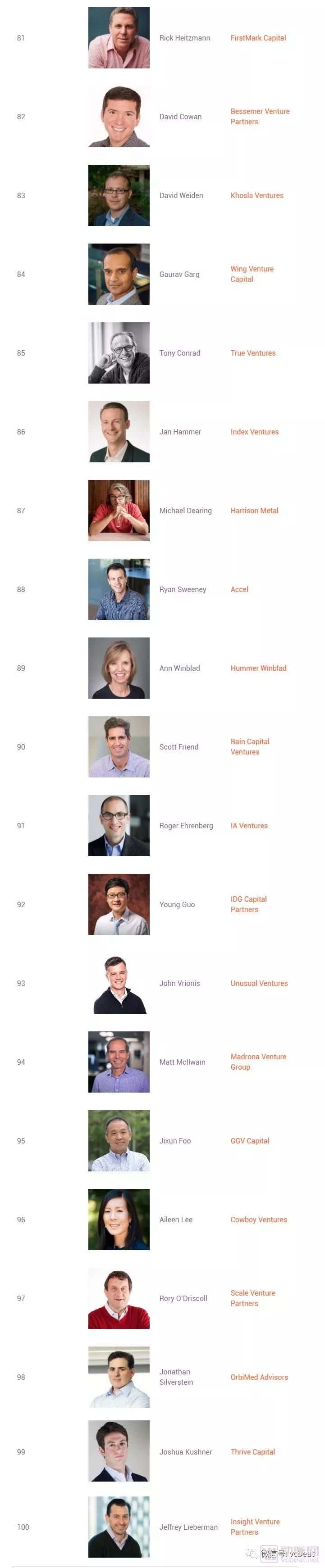 首次入围TOP100的VC有Menlo Ventures的Shawn Carolan(Roku的投资者),Ribbit Capital的Meyer Malka(Credit Karma的投资人)和Union Square Ventures的Albert Wenger(MongoDB的投资人)。