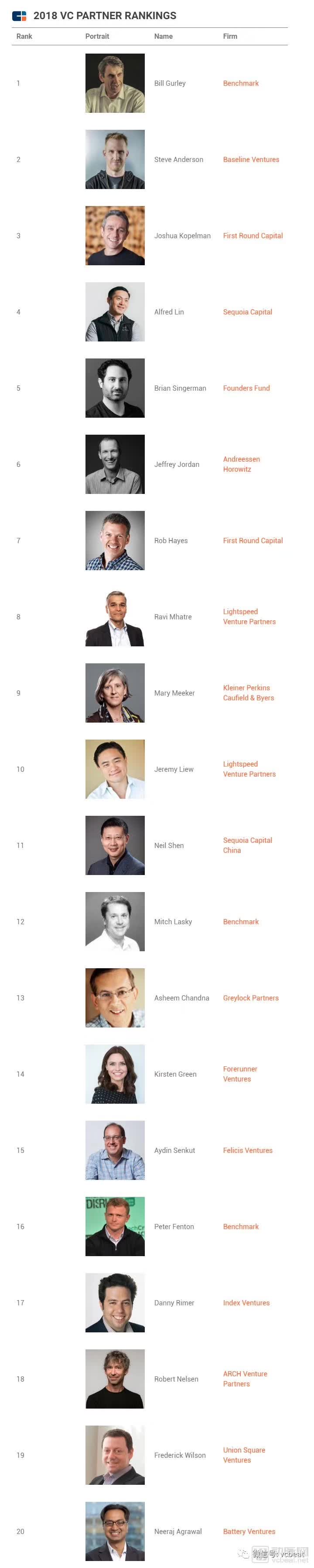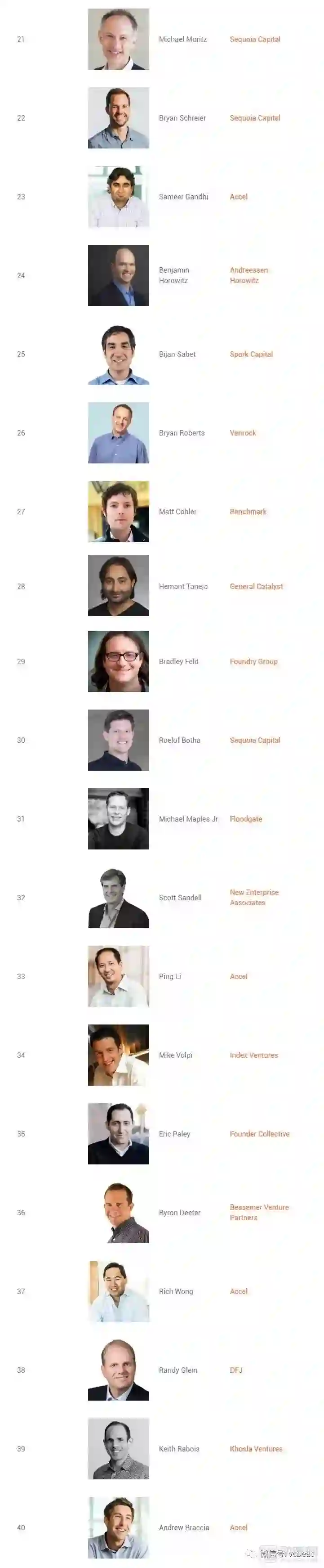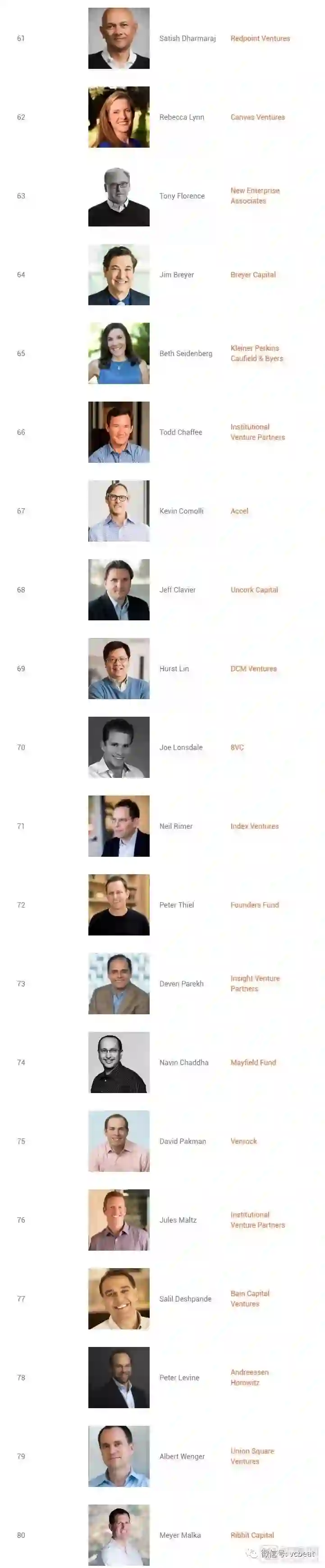 首次入围TOP100的VC有Menlo Ventures的Shawn Carolan(Roku的投资者),Ribbit Capital的Meyer Malka(Credit Karma的投资人)和Union Square Ventures的Albert Wenger(MongoDB的投资人)。