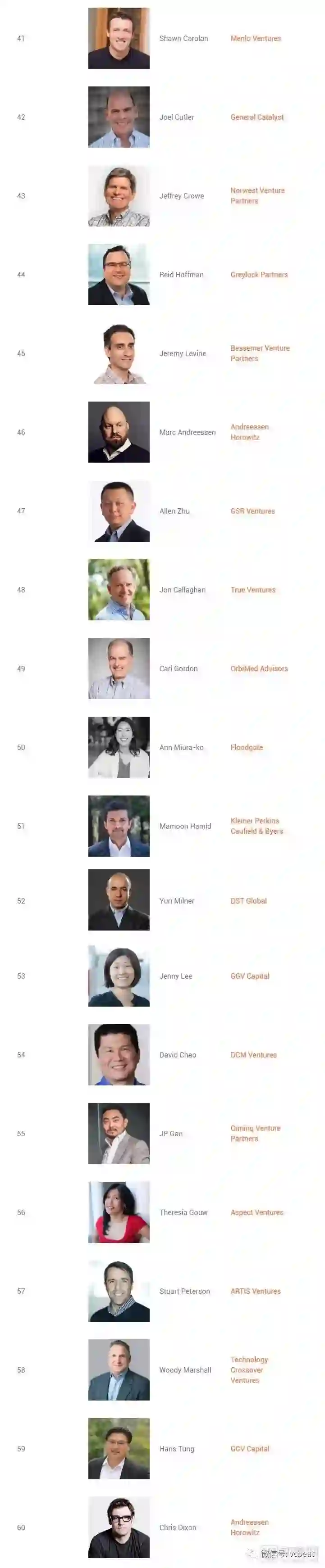 红杉资本林君叡(Alfred Lin ,第4)、光速创投Jeremy Liew(第10)、红杉资本沈南鹏(第11)、Accel Partners李平(第33)、金沙江创投朱啸虎(第47)、纪源资本李宏玮(Jenny Lee,第53)、纪源资本童士豪(第59)、DCM Ventures林欣禾(第69)、IDG资本过以宏(第92)、纪源资本符绩勋(第95) 等华人均列榜单。