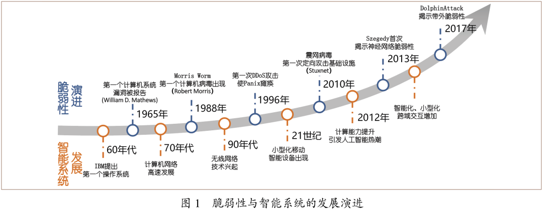 随着智能系统的快速发展和应用,其脆弱性也在不断变化演进。如图1所示,从20世纪60年代至今,智能系统经历了操作系统出现、计算机网络发展、无线网络技术兴起、设备硬件集成更新、人工智能落地应用等众多关键发展阶段。与之相对应,计算机病毒、分布式拒绝服务(DDoS)攻击、硬件木马、神经网络后门等针对智能系统的各类攻击方式也相继出现,这些攻击或多或少都利用系统脆弱性进行渗透入侵。在整个演进过程中,智能系统脆弱性呈现如下趋势。(1)数量激增:通用脆弱性和漏洞库(Common Vulnerabilities & Exposures,CVE)[2]建立于1999年,是全球最著名的公开信息安全脆弱性收集数据库。在建立最初的三年里,CVE仅收录了4394条漏洞,但到了2020年,CVE单年度就收录了31077条漏洞;(2)维度拓宽:随着智能系统的迭代更新,其脆弱性的维度逐渐增加,从最初单一的软件代码脆弱性拓展到如今包括软件、硬件、网络、环境等多成因脆弱性;(3)危害升级:最初的智能系统脆弱性往往仅影响单个设备的正常使用。但是随着“万物智联”的发展,智能系统的脆弱性一旦被利用就可能会造成严重后果。例如2010年,首个定向攻击真实世界基础(能源)设施的“蠕虫”病毒——震网(Stuxnet)病毒被检出。该病毒感染了全球超过45000个网络,造成伊朗近千台离心机损坏,核计划被迫推迟。