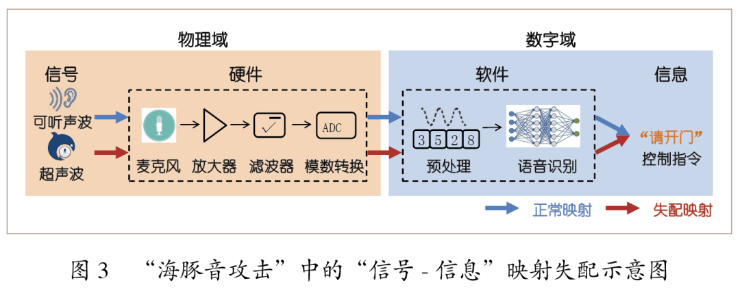 跨域交互带来映射失配。传感器与执行器是智能系统实现跨域交互的重要组成部分。传感器负责从外部感知信息,执行器负责向外部表达信息,两者共同完成了数字域和物理域之间的“信息-信号”映射。映射失配可理解为系统存在不属于设计功能的域间映射。例如,语音助手(智能系统)本应该只接收人的语音指令(正常信号),但通过利用麦克风(传感器)的非线性缺陷,超声波(异常信号)同样可以让语音助手接收语音指令(映射后的信息)。现有的脆弱性挖掘手段主要集中于设计功能和信息间的映射,因而无法找到并解决此类非功能设计的跨域映射失配问题。