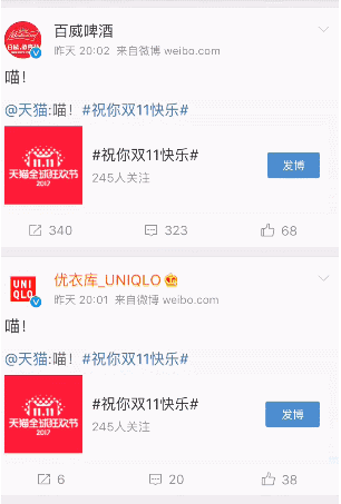 这52张海报的发布形式也非常有趣,天猫在微博上率先发了一句“喵!#祝你双11快乐#”后,百威、优衣库、肯德基等合作品牌纷纷跟进,一同在微博上转发喊“喵!”随后各自发布了自己的专属海报。