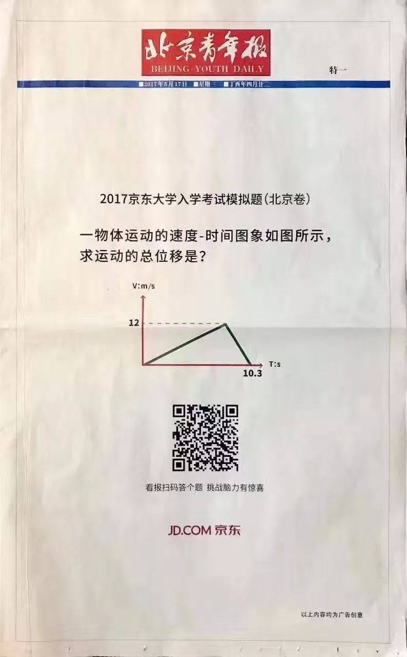 今年5月份,是618的宣传期也正值高考季,京东在各大报纸上刊登了一份全国入学考试模拟题,每个卷的题目都不一样,但所有题目的答案算出来都是“618”,题目简单有趣,成功的借着高考进行了宣传。