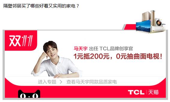除了以上几个在这些年发展迅速的品牌,阿里巴巴的根基——“淘宝”、“天猫”在广告内容上也是创意十足。众所周知,年度最大的两个购物盛宴——618和双十一,是各大电商网站血拼技术、创意、价格的日子,战场的硝烟一点即燃,广告更是要在宣传中的冲锋陷阵。