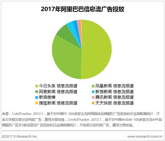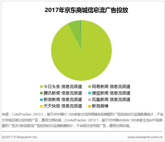 在信息流广告的投放上面,阿里巴巴和京东商城在我们所监测的信息流频道中都有做投放,两者的投放规模也差不多,但各媒体的倾向程度相差较大——京东将绝大部分的资源都投放在了今日头条上,对于阿里而言,除了这个媒体之外,凤凰新闻、网易新闻等媒体分摊的投放比例也很大。
