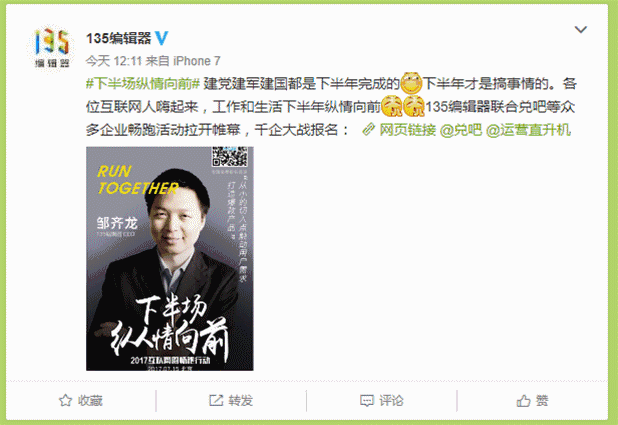 与召集人合作是所有品牌必备环节,不同于其他品牌传播只邀请明星,兑吧针对互联网企业跑的特点,活动的召集人更多是邀请了互联网公司的CEO,及各行业意见领袖。例如悦动圈、脉脉、中华万年历等百家知名互联网公司的CEO,天使湾、鼎聚创投等知名投资人,和史航、莫小棋、王东、王鹤润等影视圈明星,作为“下半场,纵情向前”互联网圈畅跑行动的召集人。活动通过为嘉宾定制下半场的宣传海报图,来表达各嘉宾的观点态度。