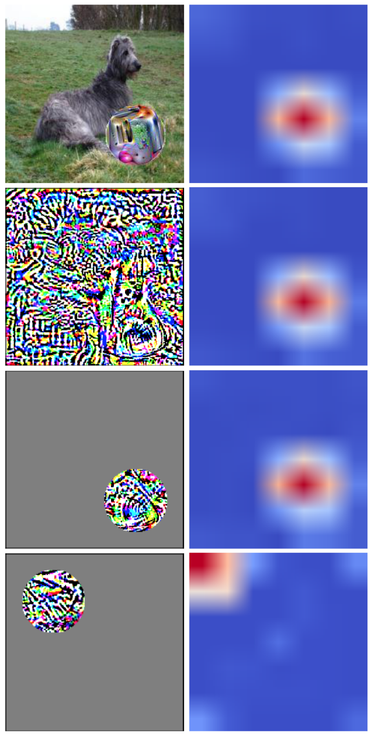 图 13. 计算每个输入上标签 “toaster” 的 Grad-CAM。第一行显示叠加在狗图像上的对抗性补丁的 Grad-CAM 输出。第二行为使用梯度扰动再现的 Grad-CAM 输出。第三行显示,如果补丁位于目标热图附近,仍然可以生成类似的热图。第四行显示,如果不能在目标 Grad-CAM 位置上附加干扰噪声,则无法直接影响 Grad-CAM 输出