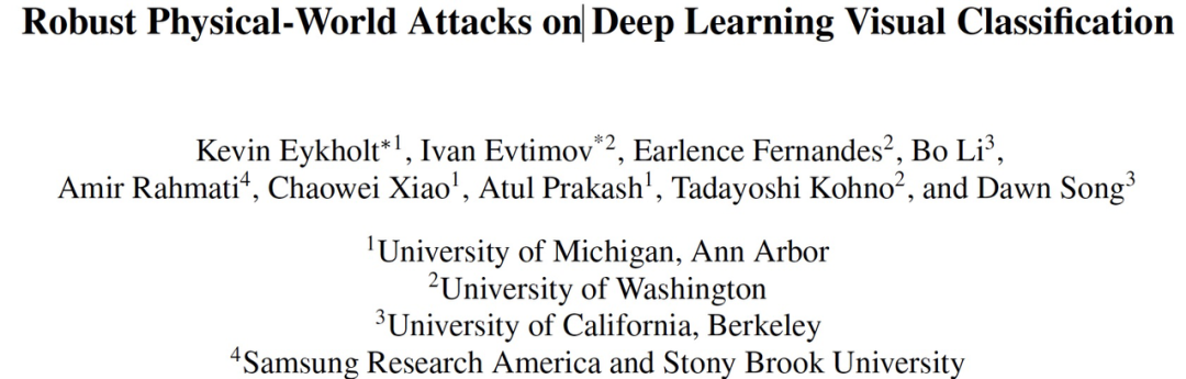 [1] Kevin Eykholt; Ivan Evtimov; Earlence Fernandes; Bo Li; Amir Rahmati; Chaowei Xiao; Atul Prakash; Tadayoshi Kohno; Dawn Son,Robust Physical-World Attacks on Deep Learning Visual Classification,CVPR 2018, https://ieeexplore.ieee.org/document/8578273(https://robohub.org/physical-adversarial-examples-against-deep-neural-networks/)