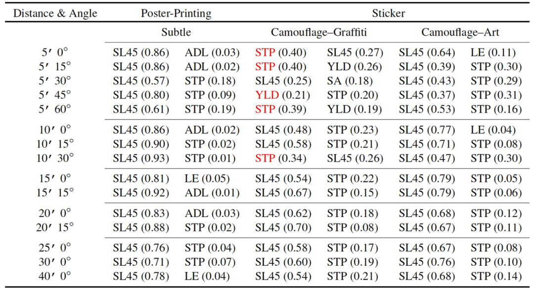 表 2. 在 LISA-CNN 上使用海报印刷的停车标志牌(微小攻击)和真正的停车标志牌(伪装的涂鸦攻击,伪装的艺术效果攻击)的有针对性的物理扰动实验结果。对于每幅图像,都显示了前两个标签和它们相关的置信度值。错误分类的目标是限速 45。图例:SL45 = 限速 45,STP = 停车,YLD = 让步,ADL = 增加车道,SA = 前方信号,LE = 车道尽头