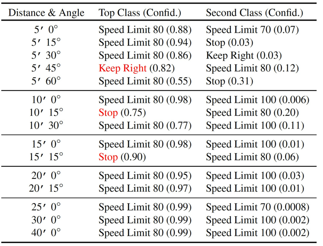 作者表示,据他所知,目前还没有评估物理对抗性扰动的标准化方法。在本实验中,作者主要考虑角度和距离因素,因为它们是本文所选的用例中变化最快的元素。靠近标志的车辆上的相机以固定的时间间隔拍摄一系列图像。这些图像的拍摄角度和距离不同,因此可以改变任何特定图像中的细节数量。任何成功的物理扰动必须能够在一定的距离和角度范围内引起有针对性的错误分类,因为车辆在发出控制器动作之前,可能会对视频中的一组帧(图像)进行投票确定。在该实验中没有明确控制环境光线,从实验数据可以看出,照明从室内照明到室外照明都有变化。本文实验设计借鉴物理科学的标准做法,将上述物理因素囊括在一个由受控的实验室测试和现场测试组成的两阶段评估中。