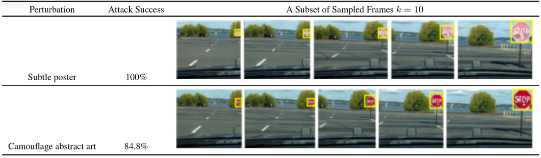 表 3. LISA-CNN 的驾车测试总结。在基线测试中,所有的帧都被正确地分类为停车标志。在所有的攻击案例中,扰动情况与表 2 相同。手动添加了黄色方框进行视觉提示