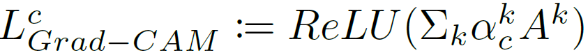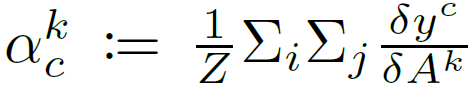 最后,按神经元的重要性加权处理特征图 A^k,并汇总以得到最终的 Grad-CAM 输出: