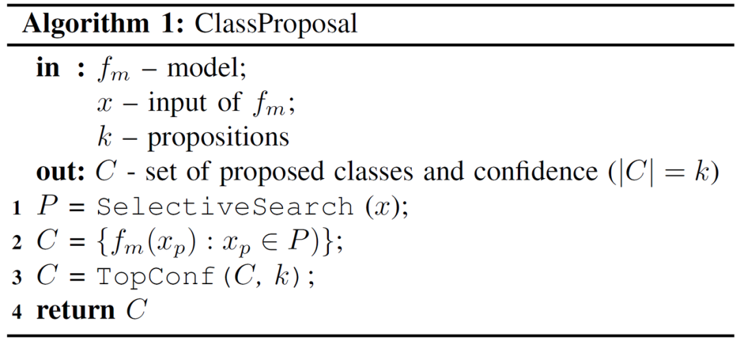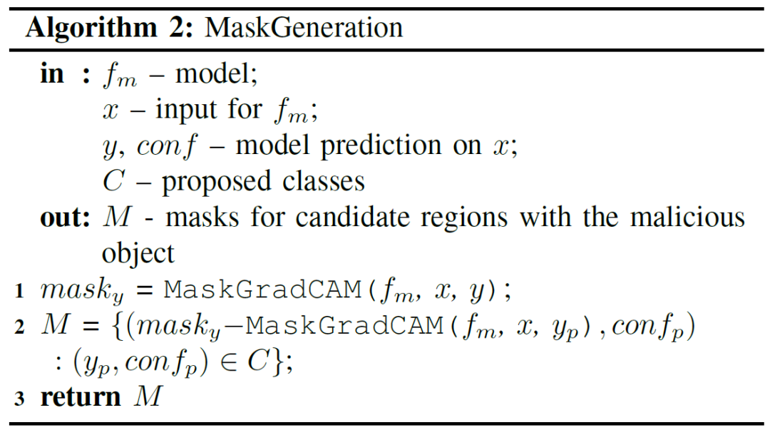一旦得到了图片中可能存在的类别列表,我们就会划出与每个预测类别更相关的区域 x。为简单起见,作者假设每个输入只能包含一个恶意对象。Algorithm 2 给出了从 x 中提取输入区域的过程。