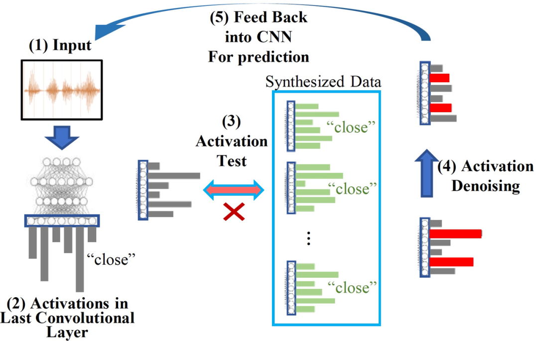 在确定了对抗性的输入音频后,对这部分音频进行数据恢复以满足后续应用的需要。作者提出了一个新的解决方案—"激活去噪" 作为音频数据的防御方法,其目标是从激活层面消除对抗性影响。激活去噪利用了上述最后一层的激活模式,这些模式与确定的预测标签有稳定的关联性。对抗性音频数据恢复方法如图 8 所示。基于检测结果,我们可以识别错误的预测标签,并在最后一层获得错误类别的标准激活模式。然后我们可以找到具有相同索引的激活。这些激活最可能是由对抗性噪声引起的,并取代了原始激活。因此,通过压制这些激活就可以恢复原始激活。