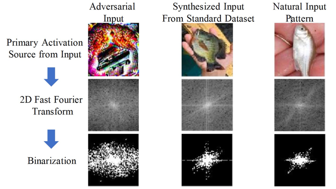 根据初步分析,输入的对抗性补丁比自然输入的语义模式包含更多的高频信息。因此,作者用一系列的变换来转换这些 patterns,如图 6 所示。经过二维快速傅里叶变换(2D-FFT)和二进制转换,我们可以观察到对抗性输入和语义合成输入之间的显著差异。