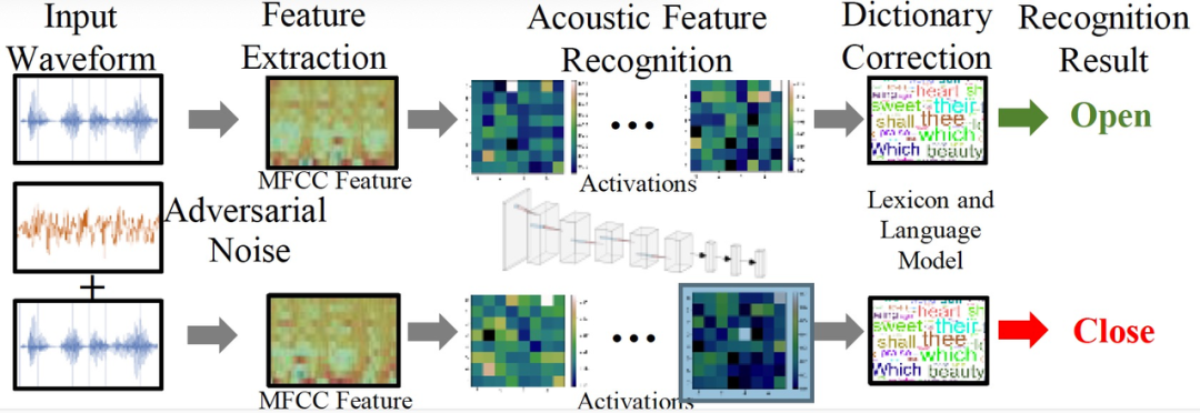 图 2 给出一个典型的音频识别过程和相应的物理对抗性攻击。首先,提取音频波形的梅尔倒谱系数 MeI-Freguency CeptraI Coefficients (MFCC) 特征。然后利用 CNN 来实现声学特征识别,从而获得候选音素。最后,应用词库和语言模型得到识别结果 "open"。将对抗性噪声注入到原始输入波形中时,最终的识别结果会被误导为 "close"。