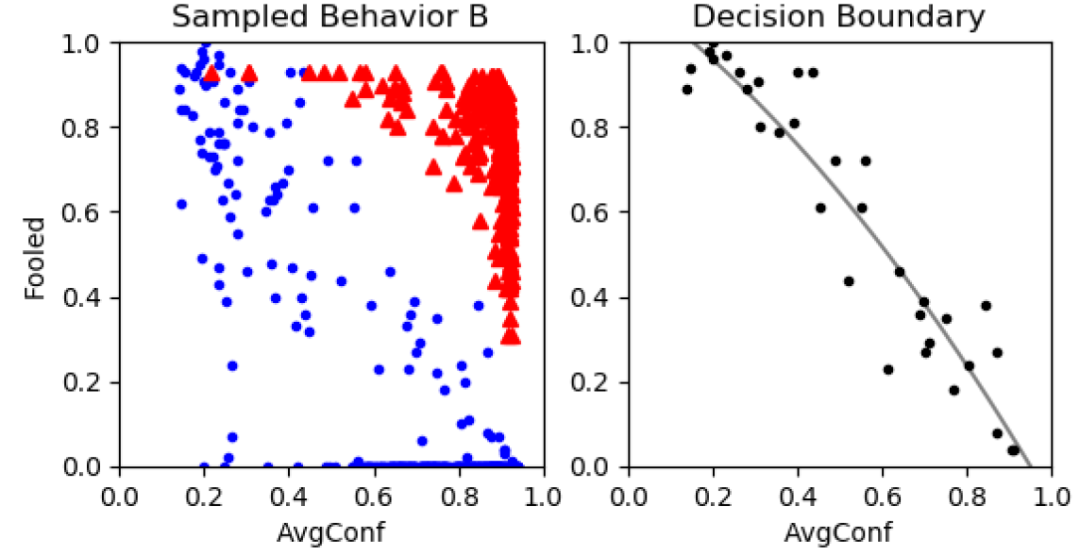 图 12. 边界检测示例,左侧,对抗性和良性指标分别被绘制成红色三角形和蓝色圆圈;右侧,来自采样点的曲线建议