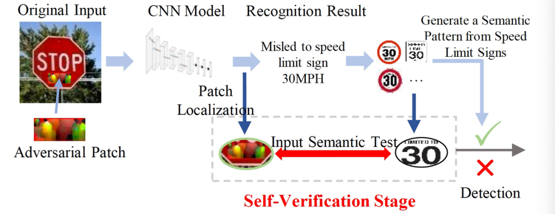 以 [1] 中给出的针对视觉领域的攻击为例,通过向输入数据注入特定的扰动,对抗性攻击可以误导深度学习系统的识别结果。通过物理攻击性方法,对抗性扰动可以集中到一个小区域并附着在真实物体上,这很容易威胁到物理世界中的深度学习识别系统。图 1 给出一个应对物理攻击的实际案例。图 1 中左图显示了一个关于交通标志检测的物理对抗样本。当在原始停车标志上附加一个对抗补丁时,交通标志检测系统将被误导输出限速标志的错误识别结果。图 1 右图展示了交通标志对抗性攻击的自我验证过程。对于每张输入图像,经过一次 CNN 推理后,验证阶段将定位重要的激活源(绿圈),并根据预测结果计算出输入语义与预期语义模式的不一致性(右圈)。一旦不一致性超过预定的阈值,CNN 将进行数据恢复过程以恢复输入图像。关于这一过程,我们会在后面详细解释。