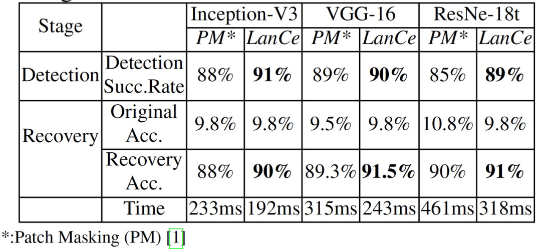 表 7 给出了总体检测和图像恢复性能。在所有三个模型上,LanCe 的检测成功率始终高于 Patch Masking。进一步,本文提出的图像恢复方法可以帮助纠正预测,在不同的模型上获得了 80.3%~82% 的准确度改进,而 Patch Masking 的改进仅为 78.2% ~79.5%。