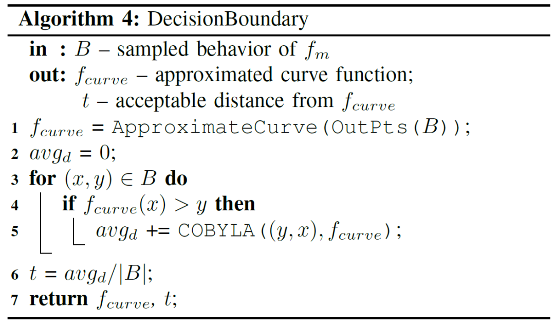 作者提出,可以使用在清洁样本上收集到的度量来近似一个曲线,其中位于曲线函数之外的点可以被归类为对抗性攻击。具体的,通过提取 x 间隔的最高 y 值的点来收集目标点,然后使用非线性最小二乘法函数来拟合生成目标曲线。然后,使用近似曲线计算曲线和点之间的距离(使用线性近似的约束优化(the Constrained Optimization by Linear Approximation,COBYLA)方法)并确定该距离是否在由位于曲线之外的清洁样本的距离所估计的阈值之内,来实现对攻击的分类。具体的边界决策过程如 Algorithm 4 所示。