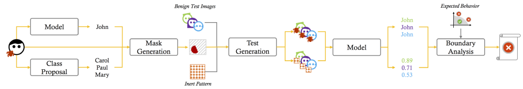 图 10. SentiNet 架构概述。使用输入的输出和类别生成掩模,然后将掩模反馈到模型中以生成用于边界分析和攻击分类的值