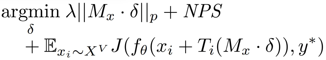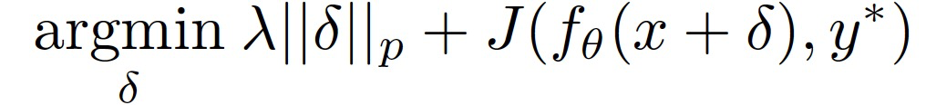 其中,J(·,·)为损失函数,其作用是衡量模型的预测和目标类别标签 y * 之间的差异。λ为超参数,用于控制失真的正则化水平。作者将距离函数 H 表征为 ||δ||_p,即δ的 Lp 范数。