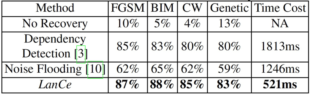 表 8 给出了整体的音频恢复性能评估。应用本文提出的恢复方法 LanCe 后,预测准确率明显提高,从平均 8% 提高到了平均 85.8%,即恢复准确率为 77.8%。Dependency Detection 和 Noise Flooding 的平均准确率都较低,分别为 74% 和 54%。