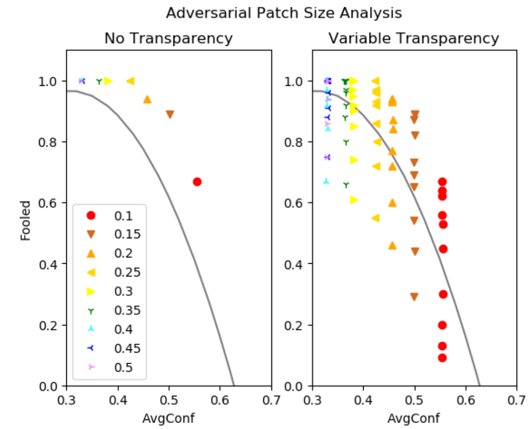 如果攻击者使用足够大的补丁,X 上的平均置信度将降低,从而降低防御的有效性。由图 15 可以看出,对于对抗性补丁,攻击的 avgConf 随着补丁大小的增加而下降。通过增加补丁的透明度,我们可以将攻击降低到阈值以下,同时保持非常高的攻击成功率。