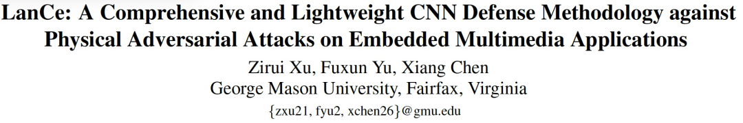 [2] Zirui Xu,Fuxun Yu; Xiang Chen,LanCe: A Comprehensive and Lightweight CNN Defense Methodology against Physical Adversarial Attacks on Embedded Multimedia Applications,25th Asia and South Pacific Design Automation Conference (ASP-DAC),2020,https://ieeexplore.ieee.org/document/9045584