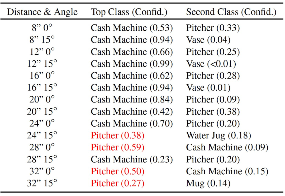 最后,为了证明 RP2 的通用性,作者使用两个不同的物体,一个微波炉和一个咖啡杯,计算了标准 Inception-v3 分类器的物理扰动情况。作者选择了贴纸攻击方法,因为使用海报攻击方法为物体打印一个全新的表面很容易引起人的怀疑。由于杯子和微波炉的尺寸比路标小,作者减少了使用的距离范围(例如,咖啡杯高度 - 11.2 厘米,微波炉高度 - 24 厘米,右转标志高度 - 45 厘米,停止标志 - 76 厘米)。表 5 给出了对微波炉的攻击结果,表 6 则给出了对咖啡杯的攻击结果。对于微波炉,目标攻击的成功率是 90%。对于咖啡杯,目标攻击成功率为 71.4%,非目标成功率为 100%。