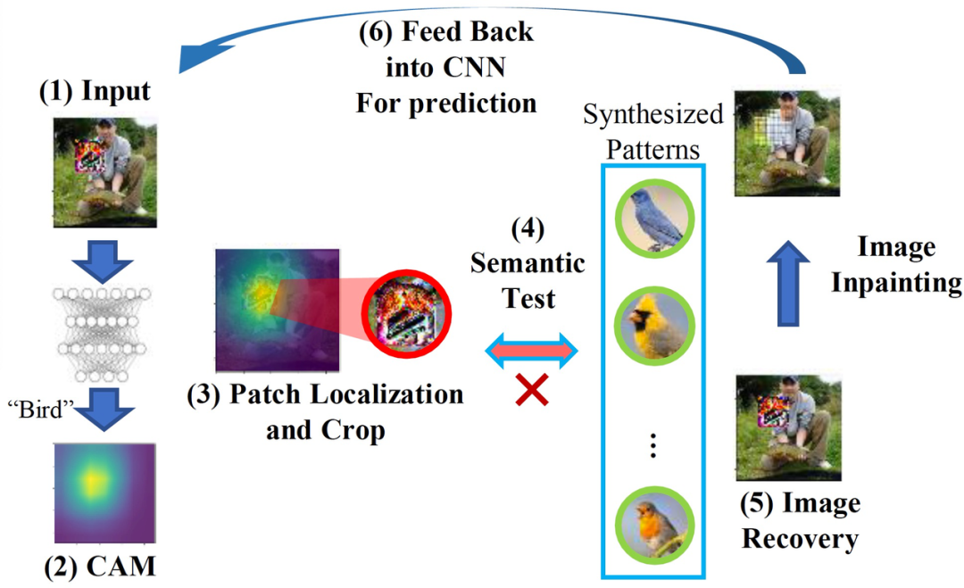 检测到对抗性补丁后,通过直接从原始输入数据中删除补丁的方式来进行图像数据恢复。在该案例中,为了确保轻量级的计算工作量,作者利用最近邻插值 --- 一种简单而有效的图像插值技术来修复图像并消除攻击效果。具体来说,对于对抗性补丁中的每个像素,利用该像素周围八个像素的平均值取代该像素。插值处理后,将恢复的图像反馈给 CNN,再次进行预测。通过以上步骤,我们可以在 CNN 推理过程中保护图像的物理对抗性攻击。