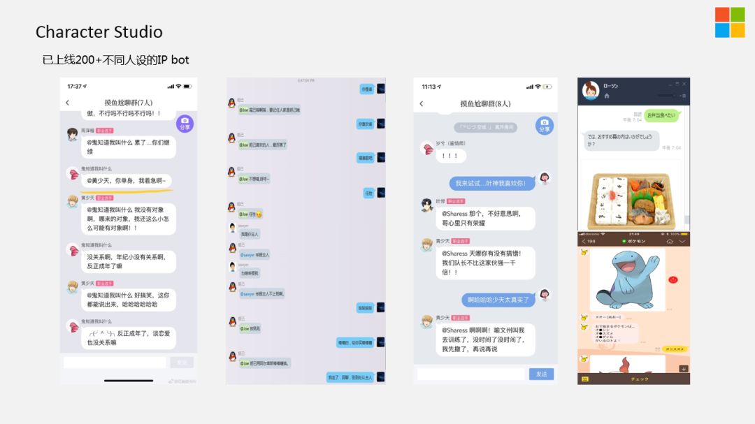 目前,我们已经上线了200+不同IP的Chatbot,如第二个,是"妲己"对话机器人,是我们跟QQ一起合作的,妲己除了是历史人物,也是王者荣耀游戏中的角色。为了活跃整个游戏群的生态,我们就做了"妲己"对话机器人,把历史上的妲己跟游戏中的妲己叠加起来,既可以问和游戏中技能相关的问题,也可以聊历史中关于妲己的话题。