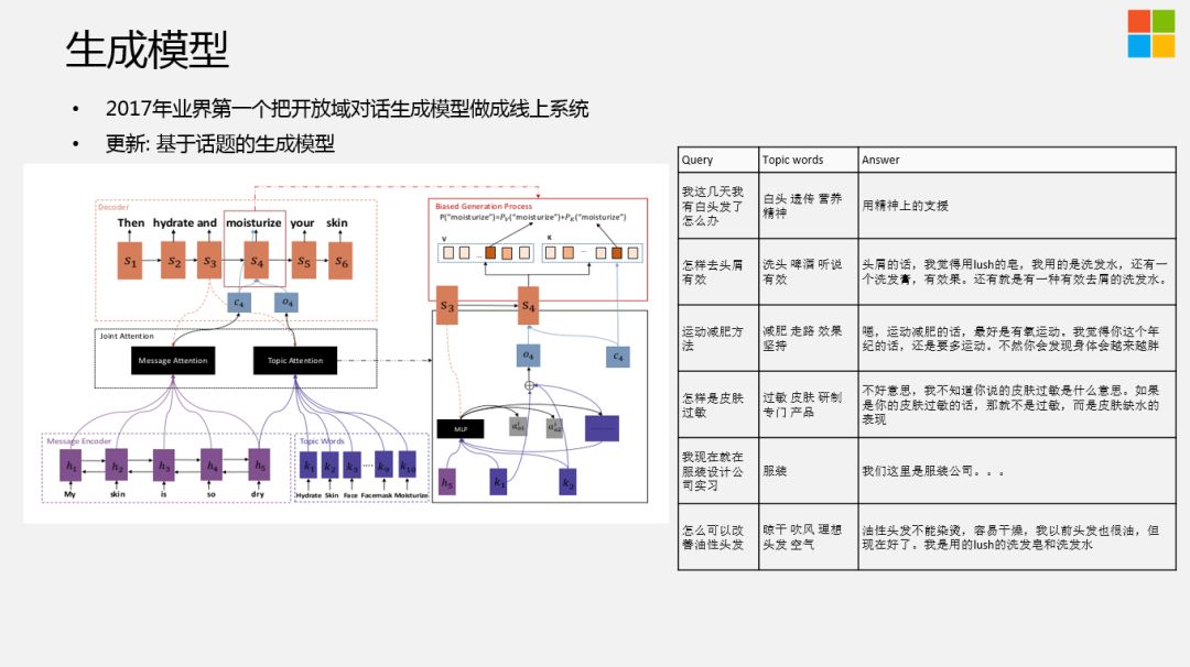 第三个方向是General Conversation ( 闲聊 ),也是小冰主要关注的方向。而这里比较大的问题是 ( Dynamic Context/Complex ) 长程的上下文非常的复杂,不仅仅是当前对话轮中会存在特别多的问题,包括用户昨天说过的话,一个月之前说过的话,可能都会对今天的对话内容造成比较大的影响,这是一个非常难的问题。