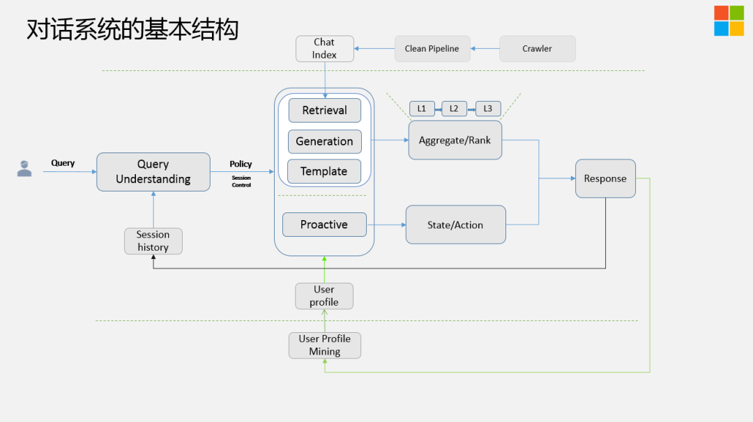 接下来分享下,我们对话系统的基本结构,宏观上,整体的架构跟搜索推荐的架构非常像: