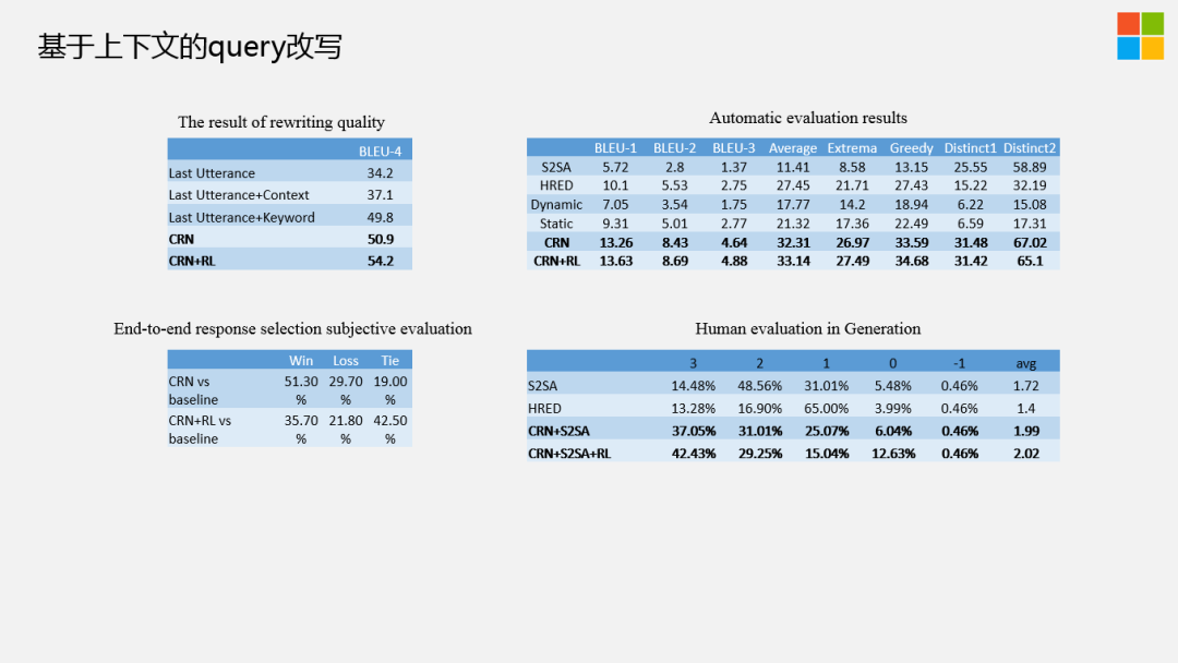 我们来看下,基于上下文的query改写结果,不管是人工评判,还是自动评判,都有比较好的结果。简单提一下,如图中左下角,我们用改写好的框架运行在实际的线上系统,端到端的衡量改写的Query,我们发现不做强化学习的模块,要高于baseline20个点,但是加入强化学习后的结果不是特别的多。我们再细致的看右边标注的结果,就是-1,0,1,2,3,其中1,2,3相对来讲是比较好的回复,大家可以看到0的比例会显着高于baseline也会高于不加LR的模块。在实际中,我们采用的是CRN的方法。