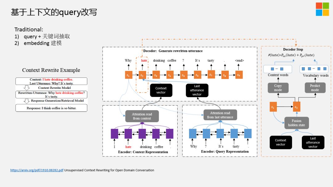 Step3:但是在实际的应用场景中,我们无法得到 response 的信息,所以我们采用一个基于复制网络 ( copy-net ) 的深度模型来学习这部分先验知识,并使用这些构造好的数据作为训练集,利用该训练集进行多轮对话上下文改写模型训练 ( Context Rewriting Network )。