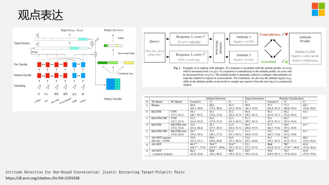 业界在做系统时,会把TAG提取和意图分开。特别是在做slot filling ( 槽位填充 ) 时,会先分意图,再做slot抽取。我们发现,如果把这两个工作组合在一起做,会有更好的效果提升。右上角是我们的一个做法,可以给她的观点根据不同的Entity,不同事物做设定,当有新的Response回来之后,会跟当前的设定做逻辑一致性校验,比如喜欢吃辣的或者不喜欢吃辣的,Response如果是吃火锅,对应的就是喜欢吃辣的,如果人设是不喜欢吃辣的,那么这种Response需要尽可能的去掉。更多详情可参考原论文。