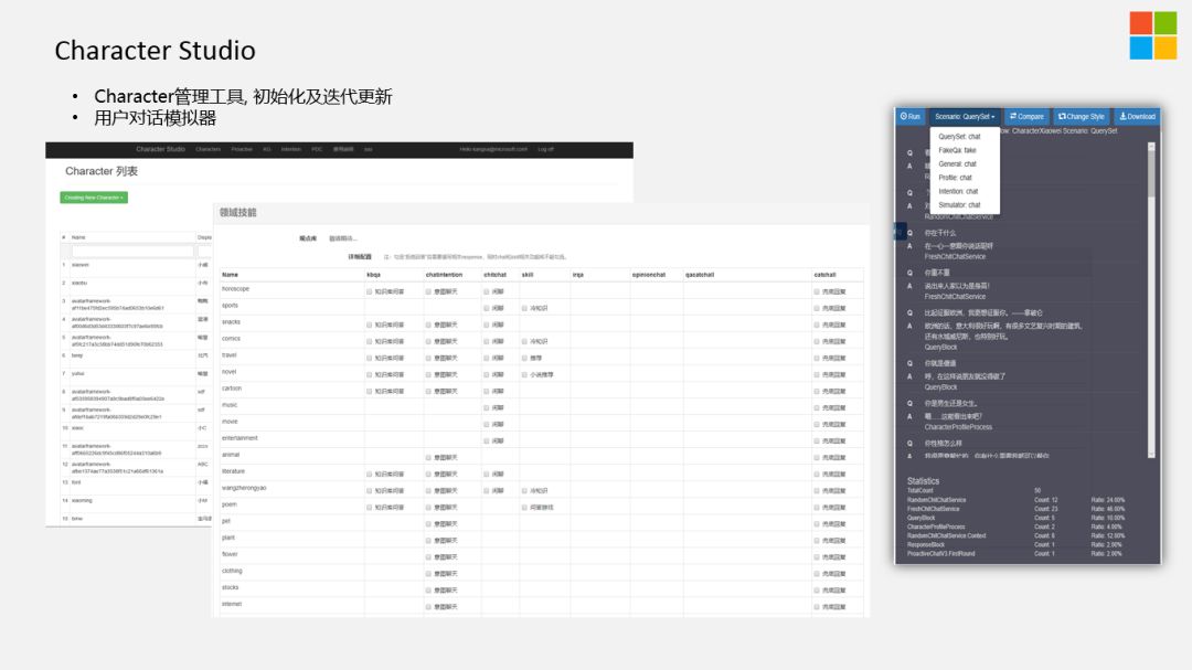 对话系统是一个比较复杂的过程,如果依靠人的力量做交互,是一个不太合理的方法,所以我们开发了一个对话模拟器。在里边有两个bot,一个是真实的Character bot,一个是Policy bot,Policy bot会利用共感模型等方法,分析当前的状态,来模拟用户控制对话的节奏,我们会对打造的AI beings的各种回复进行打分,哪些模块覆盖到了,哪些模块没有覆盖到。通过模拟器,我们可以非常快速的校验不同IP的Chatbot做的好不好,每个模块会有自己恒定的指标,可以检测出每个模块的具体情况。