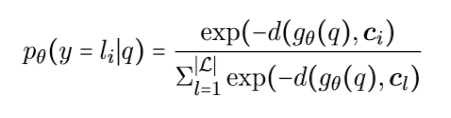 我们认为C1 ( 见上图 ) 是对应的类的中心点,同样C2,C3也是各自对应的类的中心点。当一个新的Query来了之后,我们会对新的Query也进行建模,得到一个表达X,当前的X跟已有类别的distance,可以通过下面的方式,进行衡量: