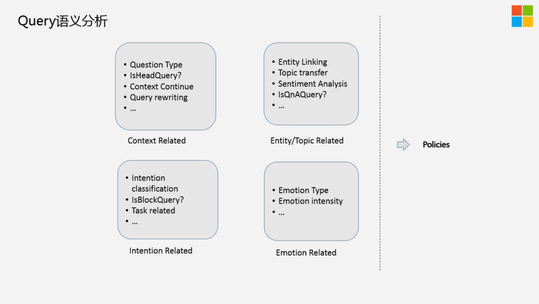 首先Query来了,我们会对Query做分析,进行Query Understanding,不仅仅分析当前的Query,还会从Session里提取Session History来做分析,生成两大类的Policy,一类是被动式的,一类是主动式的。